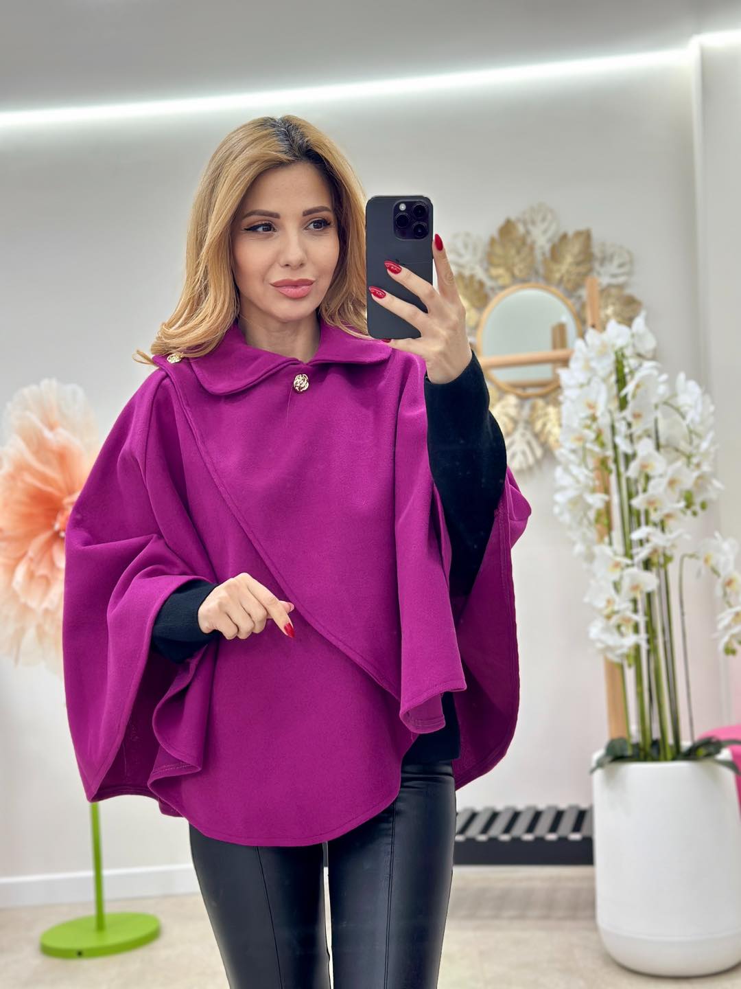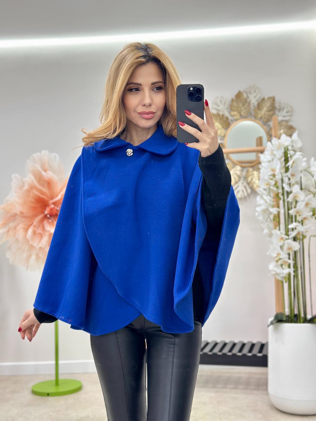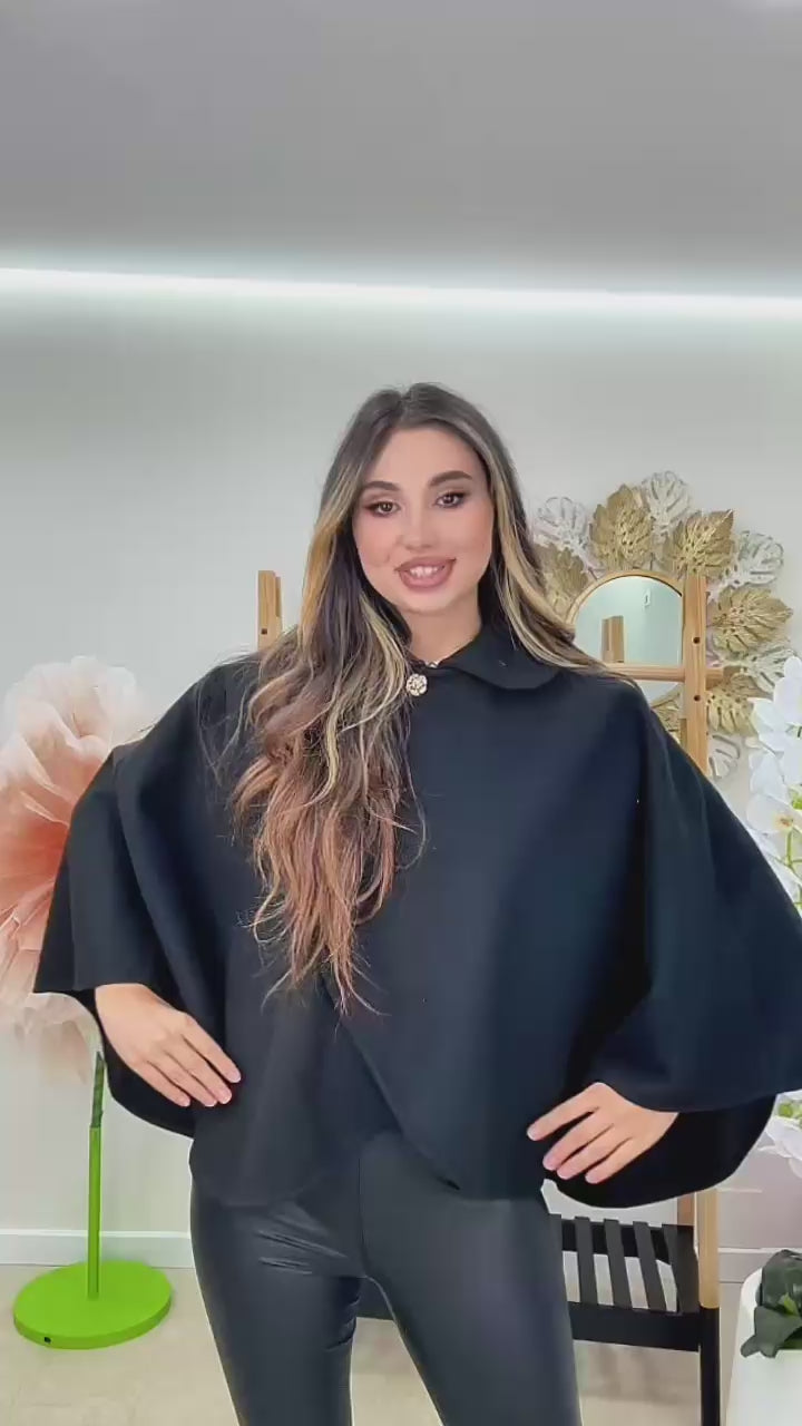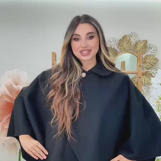Capa nu are un bust delimitat, prezinta un guleras rotund si un sistem de prindere parte-peste-parte (stil lalea) cu 2 nasturi aurii in forma de trandafir.