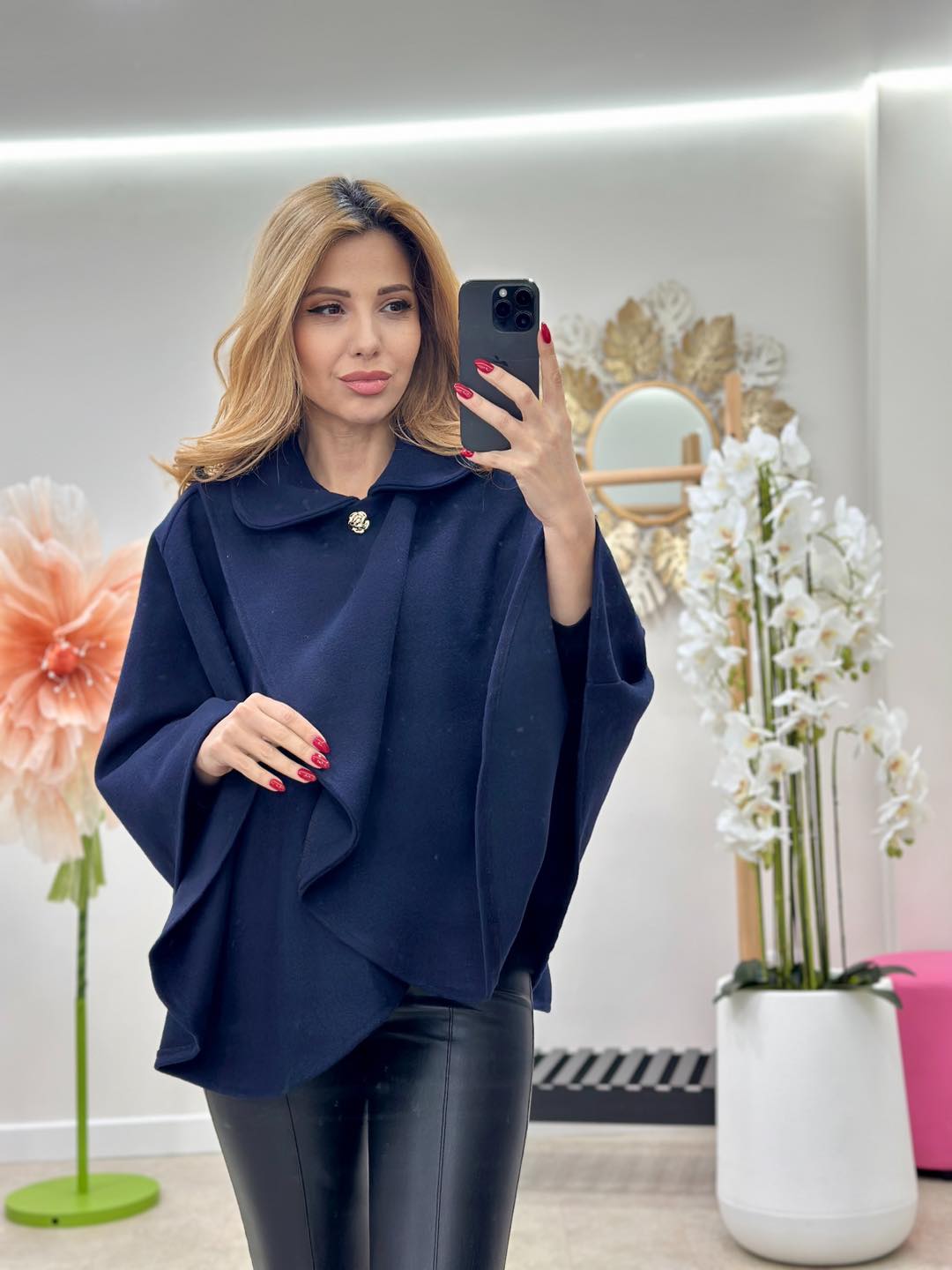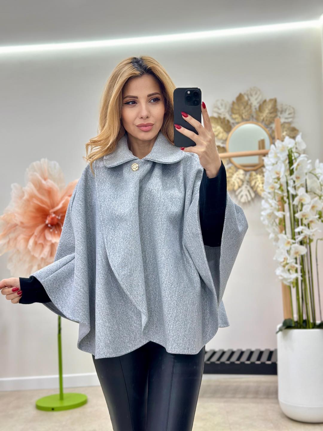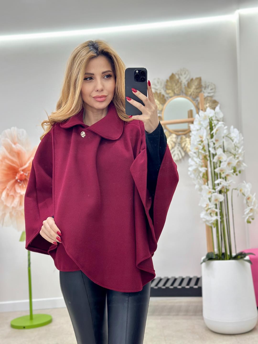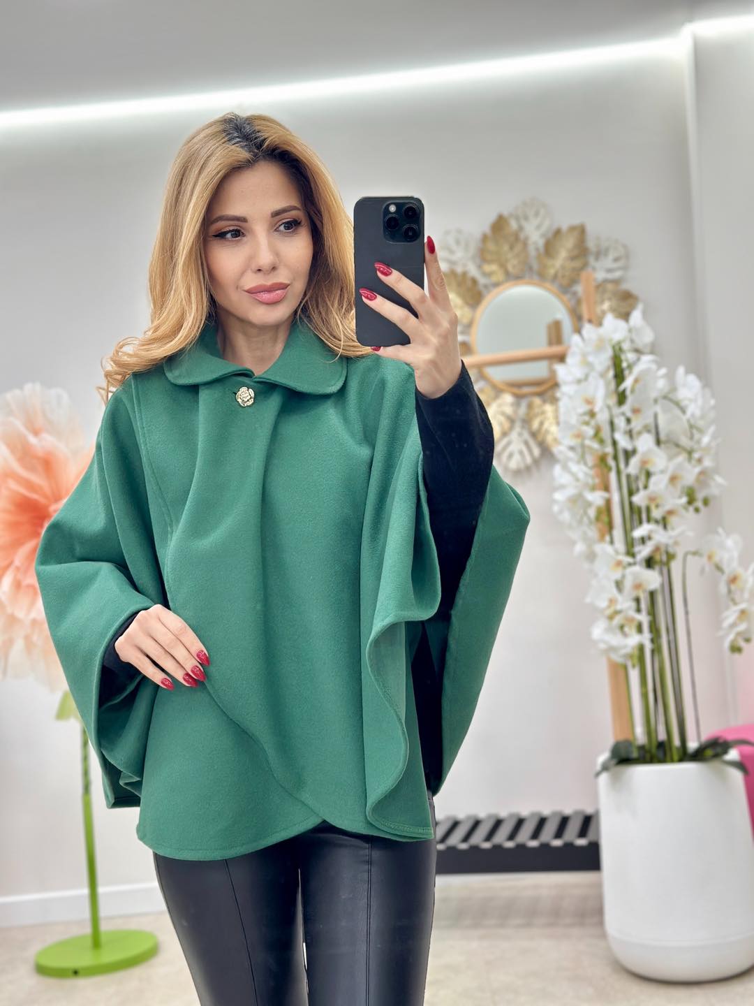 Capa nu are un bust delimitat, prezinta un guleras rotund si un sistem de prindere parte-peste-parte (stil lalea) cu 2 nasturi aurii in forma de trandafir.