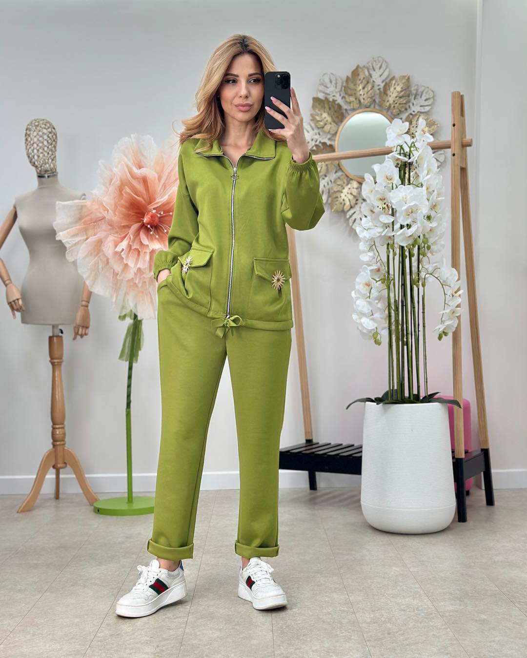 Prezinta doua buzunare cu clapeta, pe fiecare este atasata cate o brosa in forma de soare si fermoar.