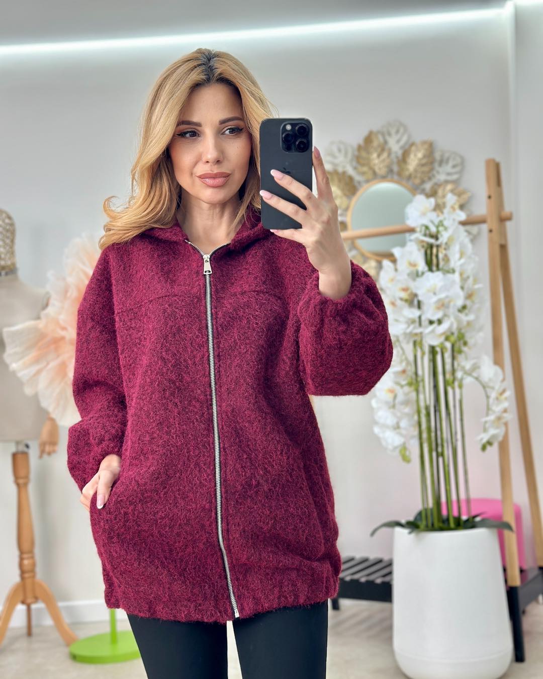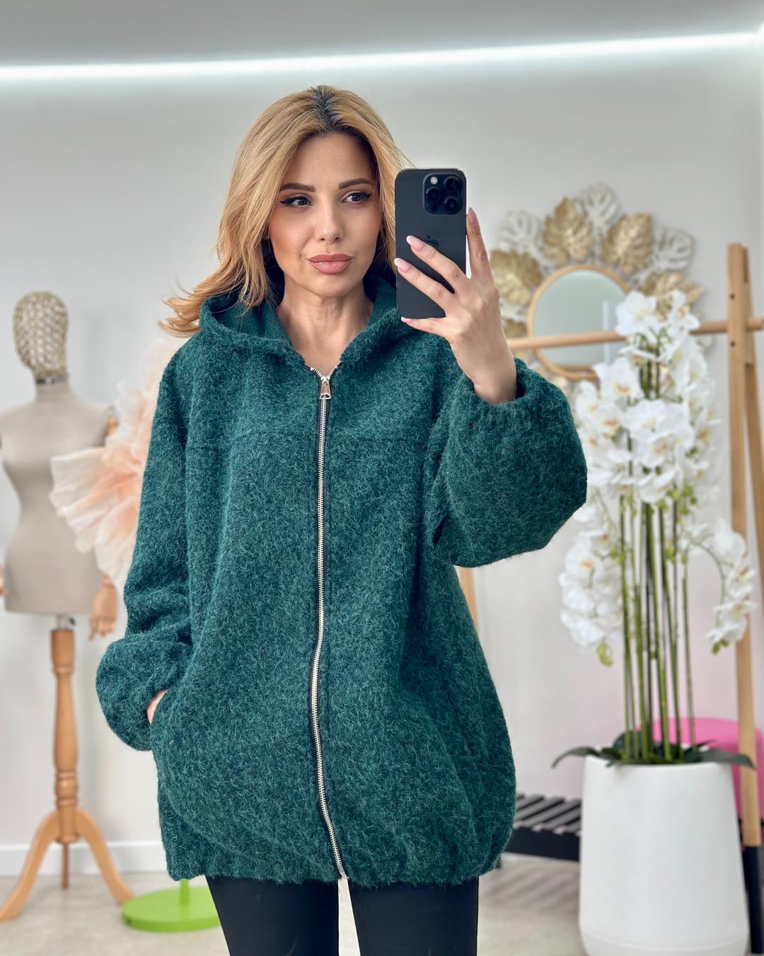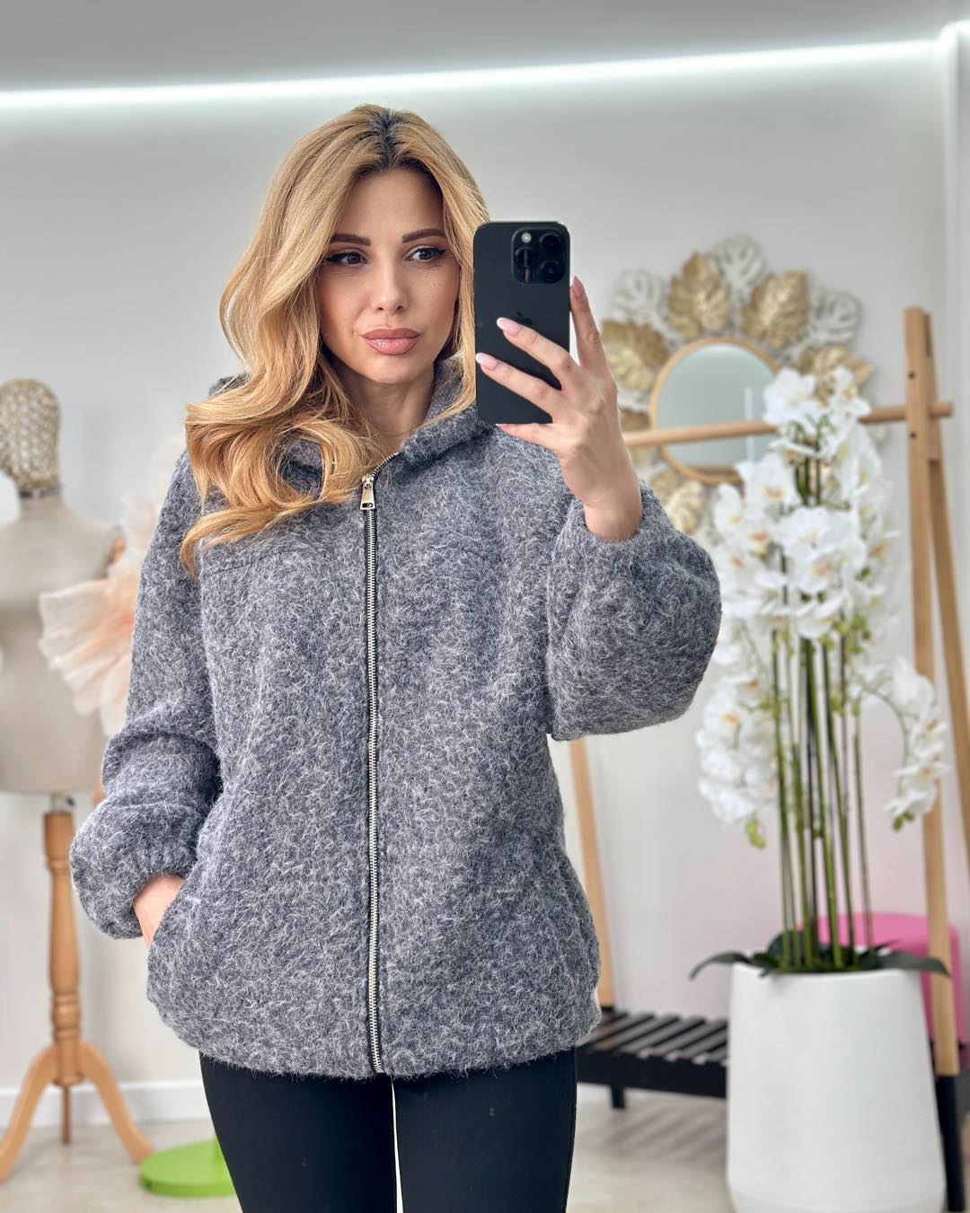 Jacheta prezinta gluga, fermoar, buzunare si elastic la maneci si sold.
